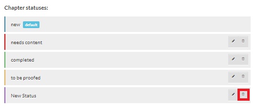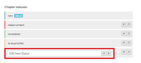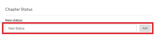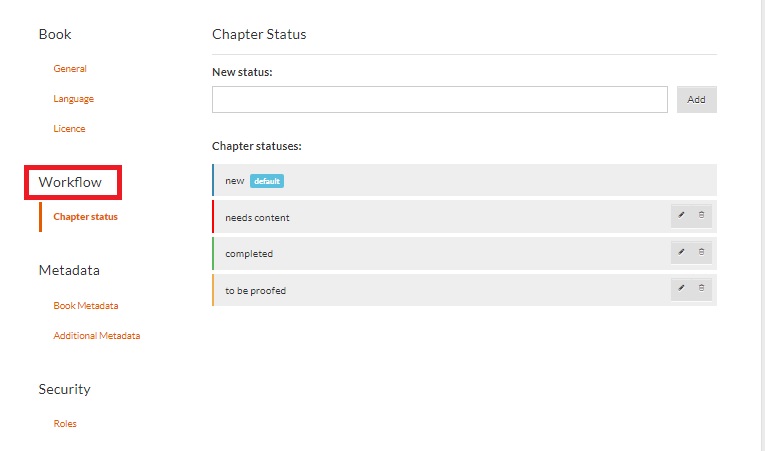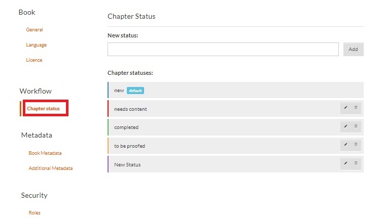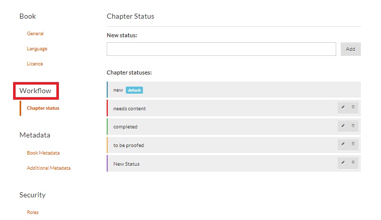 The Workflow section helps you set the Chapter Status. There are 4 default statuses available: New (Default), Needs Content, To Be Proofed, and Completed. You can rearrange them by dragging and dropping.