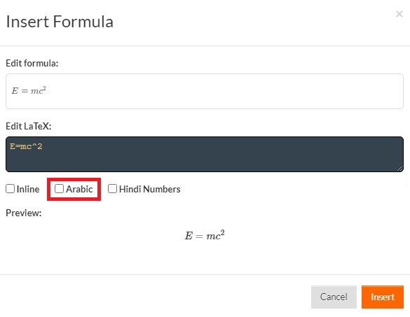 Arabic: The Arabic formula writing feature lets users write formulas in Arabic. It changes English letters and symbols in a formula to Arabic ones. This feature also allows writing Arabic characters from right to left in a formula.
