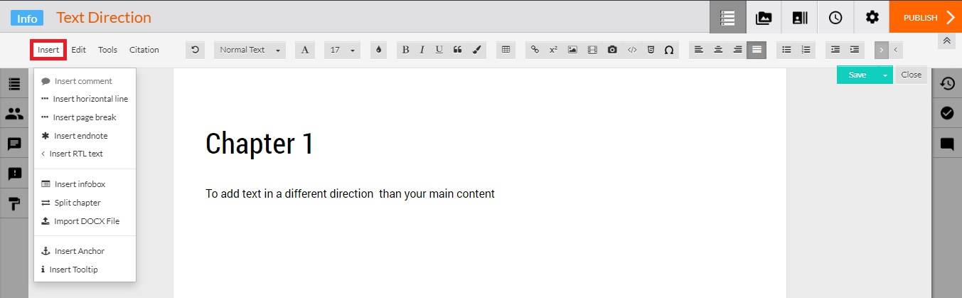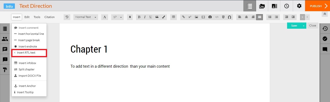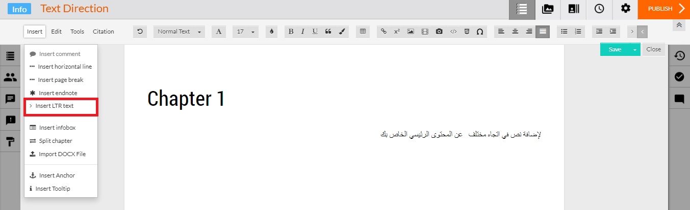 2. How do I insert RTL or LTR text in the Chapter Editor?