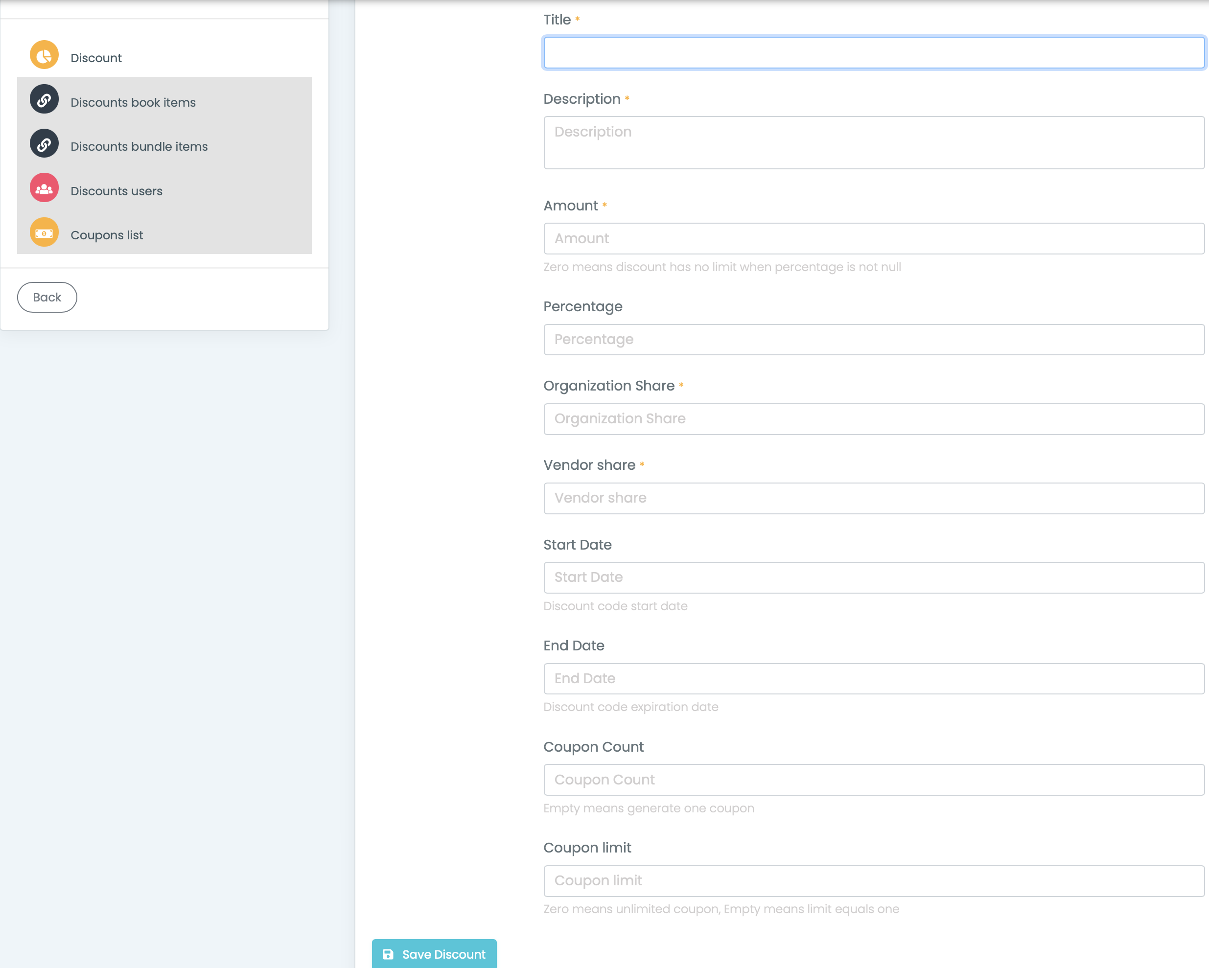 Publishin Panel admins and Platform owners are able to define coupons in collaboration with their vendors. Coupons can be either given to pre-determined set of users (such as students of a school) or be advertised in various social media channels.
