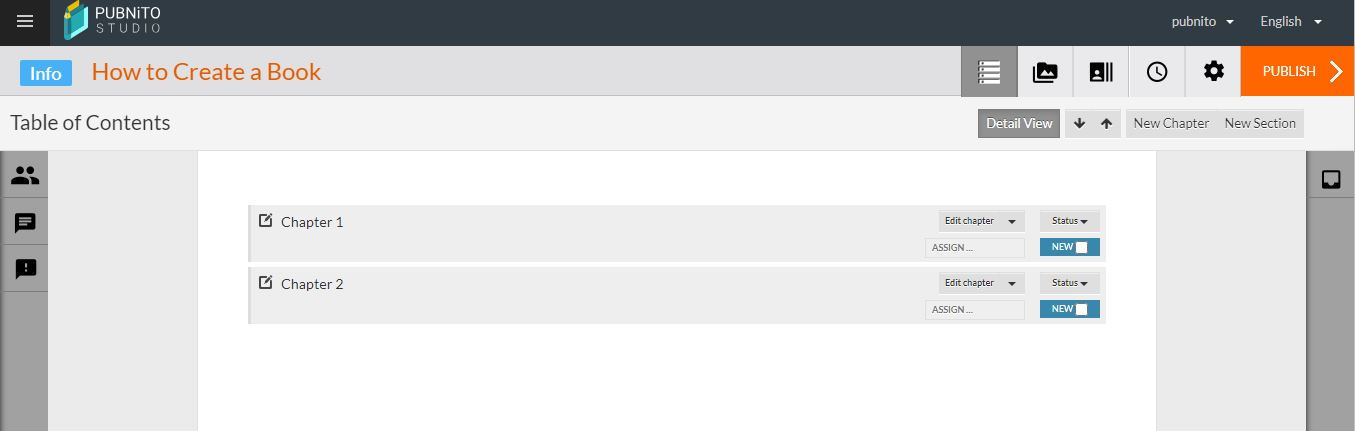 As observed in the Edit Interface, the Table of Contents serves as the default view within Studio's editing interface. It is where you create new chapters and sections and start editing chapters. You can also rearrange sections and chapters using drag-and-drop and modify the current status of each chapter.