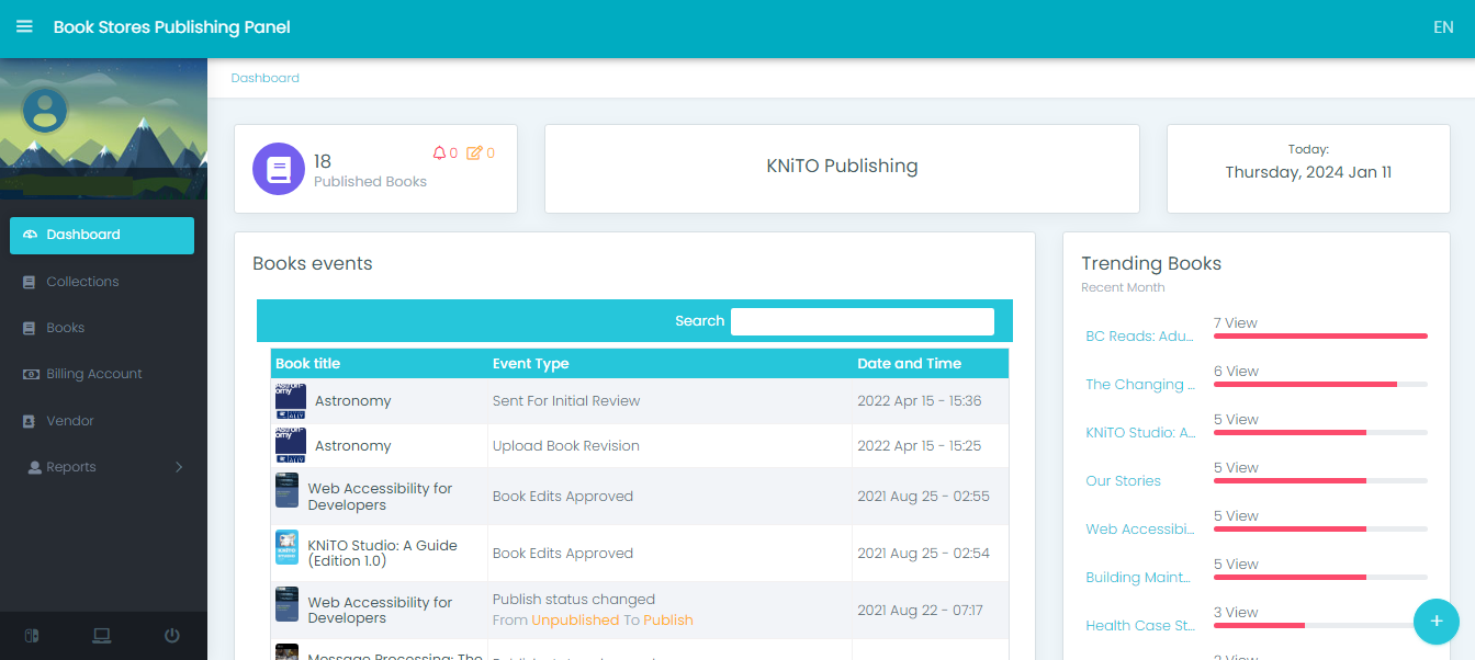 This dashboard provides a detailed view of your platform's activities, including user interaction, book publishing, and vendor actions. Users: It shows how many people have registered on your platform. Vendors: Counts the number of vendors working ...