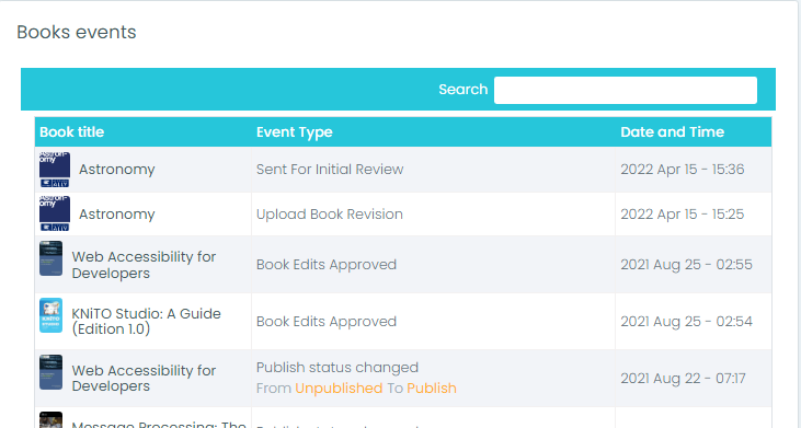 - Book Events: Lists the titles of your books and what actions were taken on